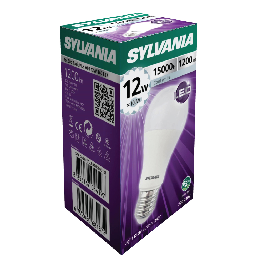 หลอดไฟ LED Bulb E27 รุ่น ToLEDo Basic Plus A60 12W E27 ทรง A60 ขนาด 12W ยี่ห้อ ซีลวาเนีย ให้ความสว่างสูง ประหยัดไฟด้วยเทคโนโลยีของแอลอีดี สามารถใช้แทนหลอดเดิมได้ทันที เหมาะสำหรับ โรงแรม รีสอร์ท อพาร์ทเม้นท์ บ้าน และ คอนโด เป็นต้น